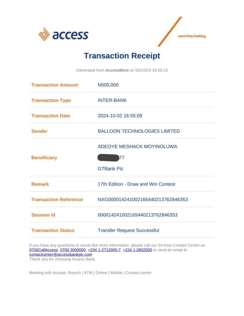 Here is a receipt of the transfer we made to Meshack Adeoye