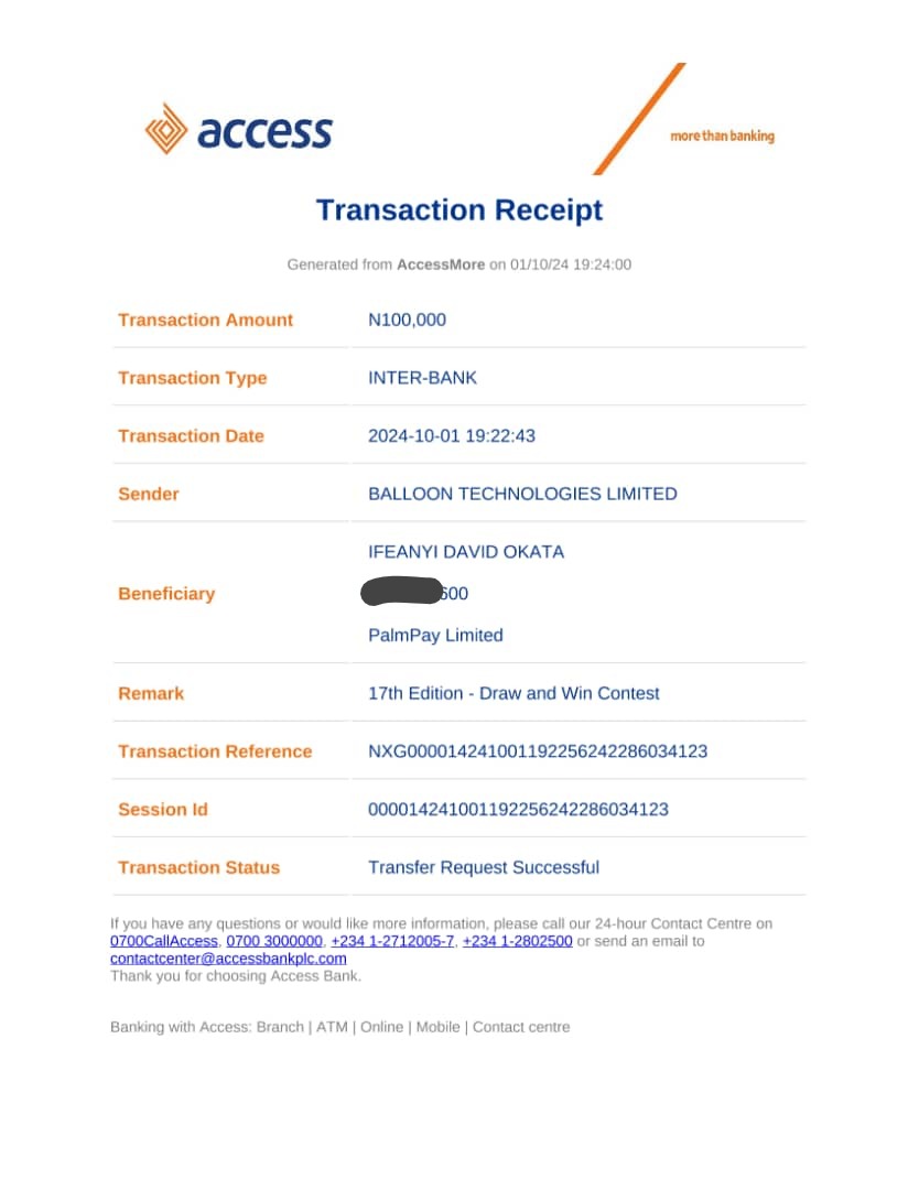 Here is a receipt of the transfer we made to Ifeanyi David Okata