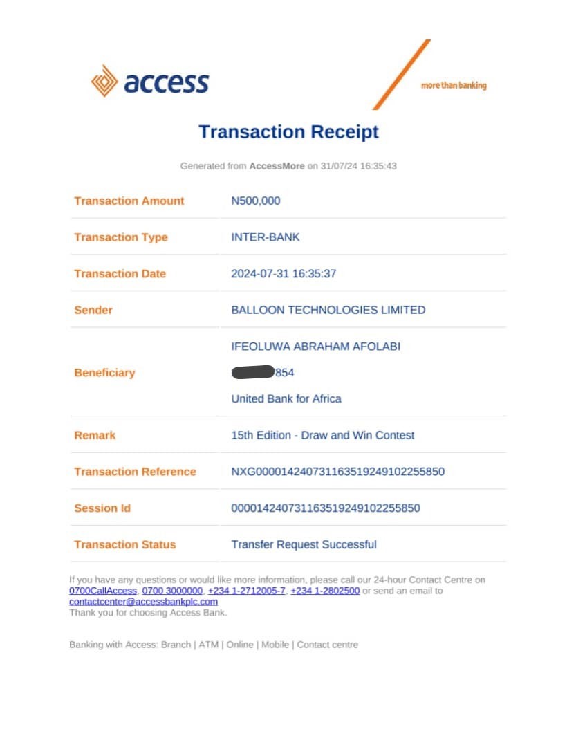 Here is a receipt of the transfer we made to Afolabi Ifeoluwa Abraham