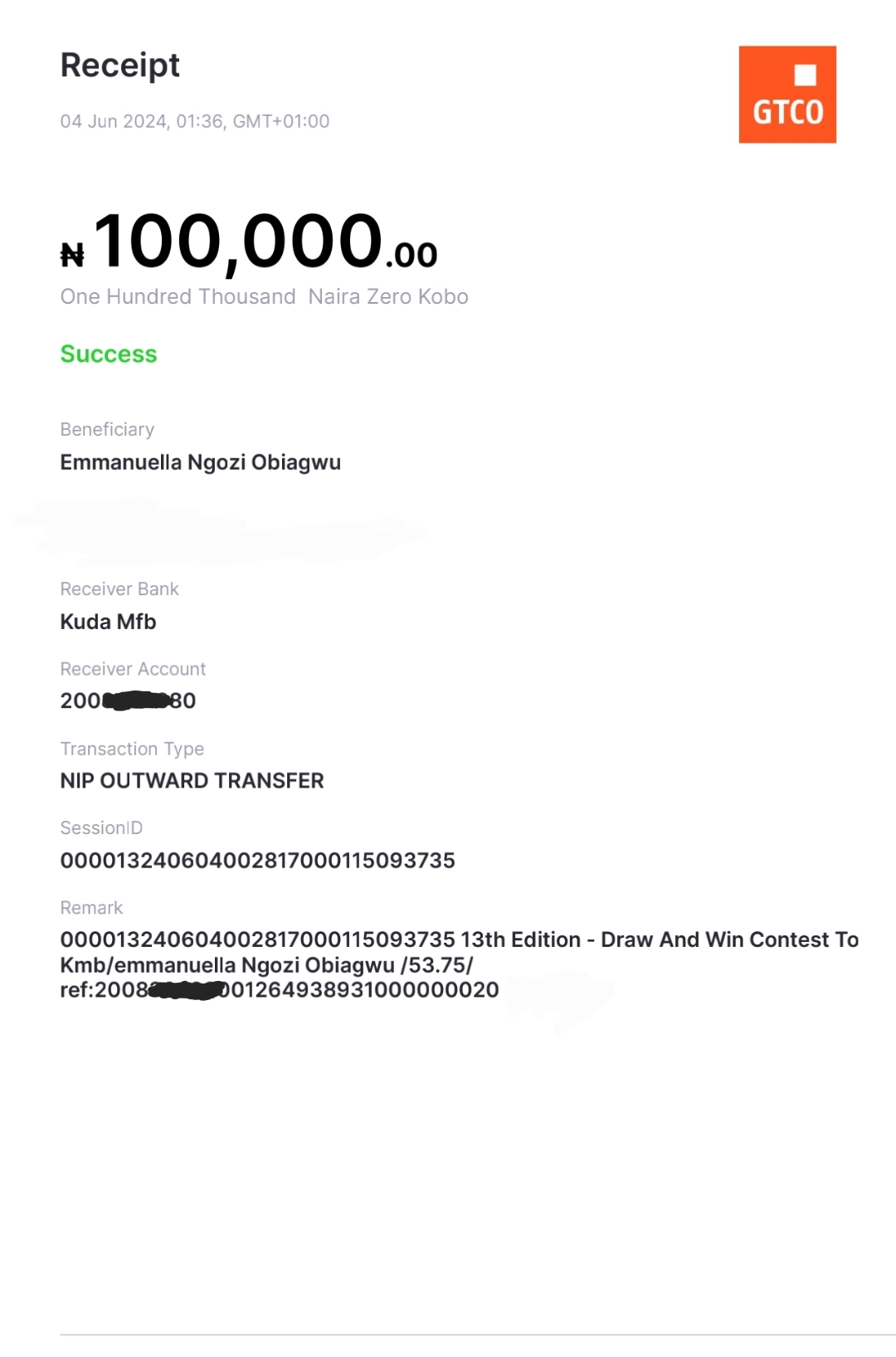 We say a big congratulations to Emmanuella Obiagwu for emerging as the 2nd Runner Up of the 13th Edition - Draw and Win [Completed]