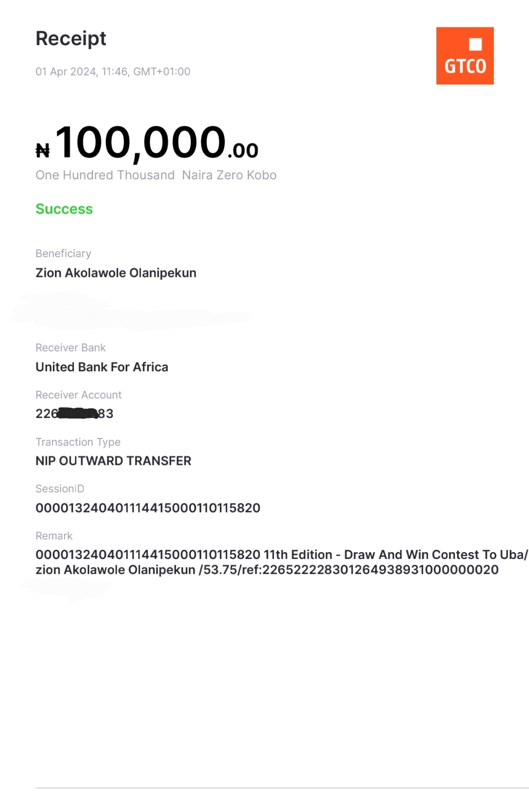 Here is a receipt of the transfer we made to Zion Olanipekun
