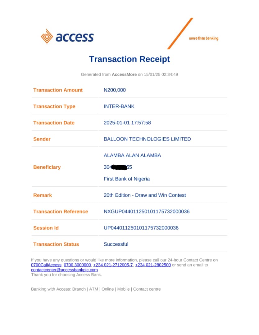 We say a big congratulations to Alamba Alan Alamba for emerging as the 1st Runner Up of the 20th Edition - Draw and Win [Completed]